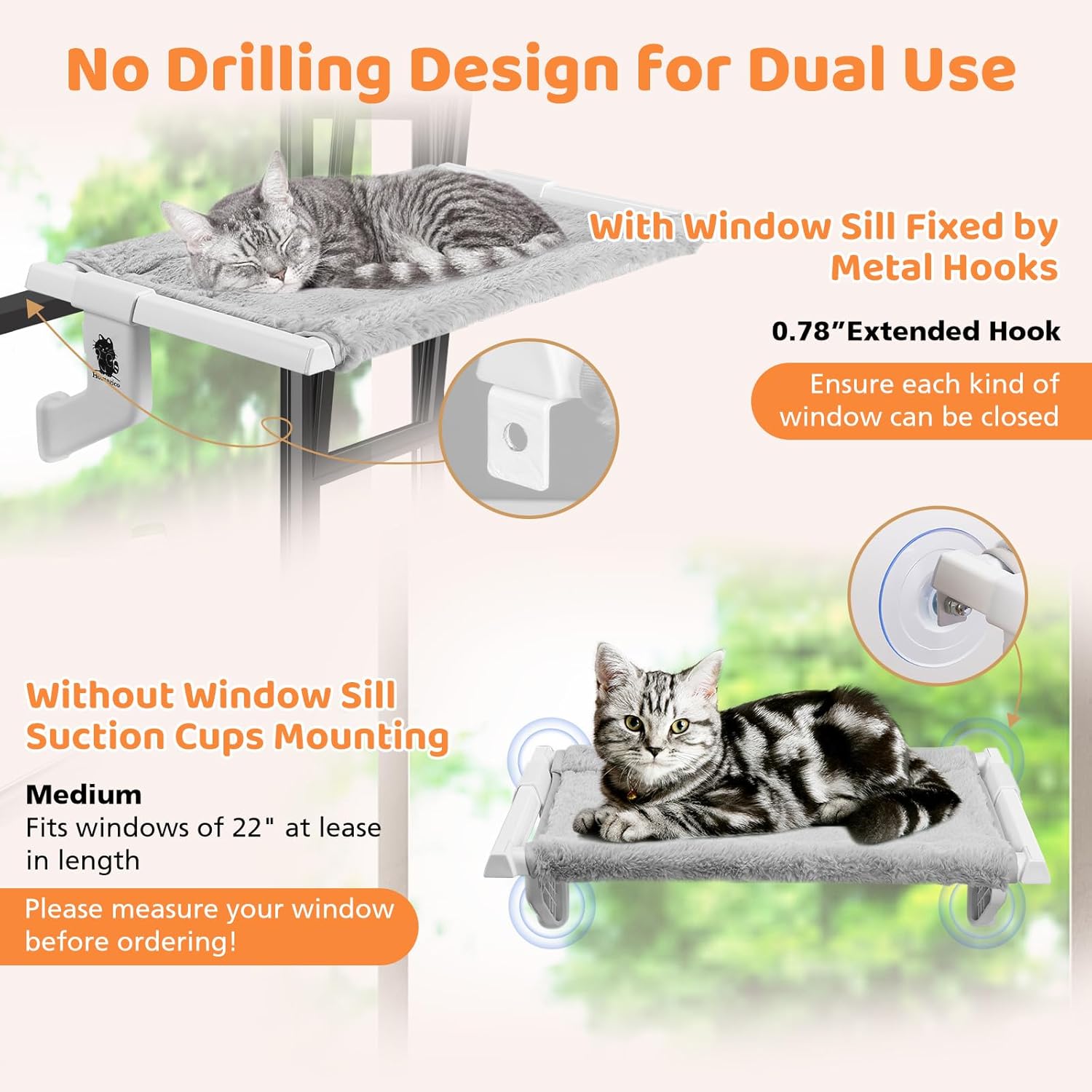 2 in 1 Cat Window Perch,Cat Hammock with Metal Sliding Clamping Adjustment,Removable Two Fabrics Cover,4 Suction Cups,Window Beds for Indoor Cat(22"x13")