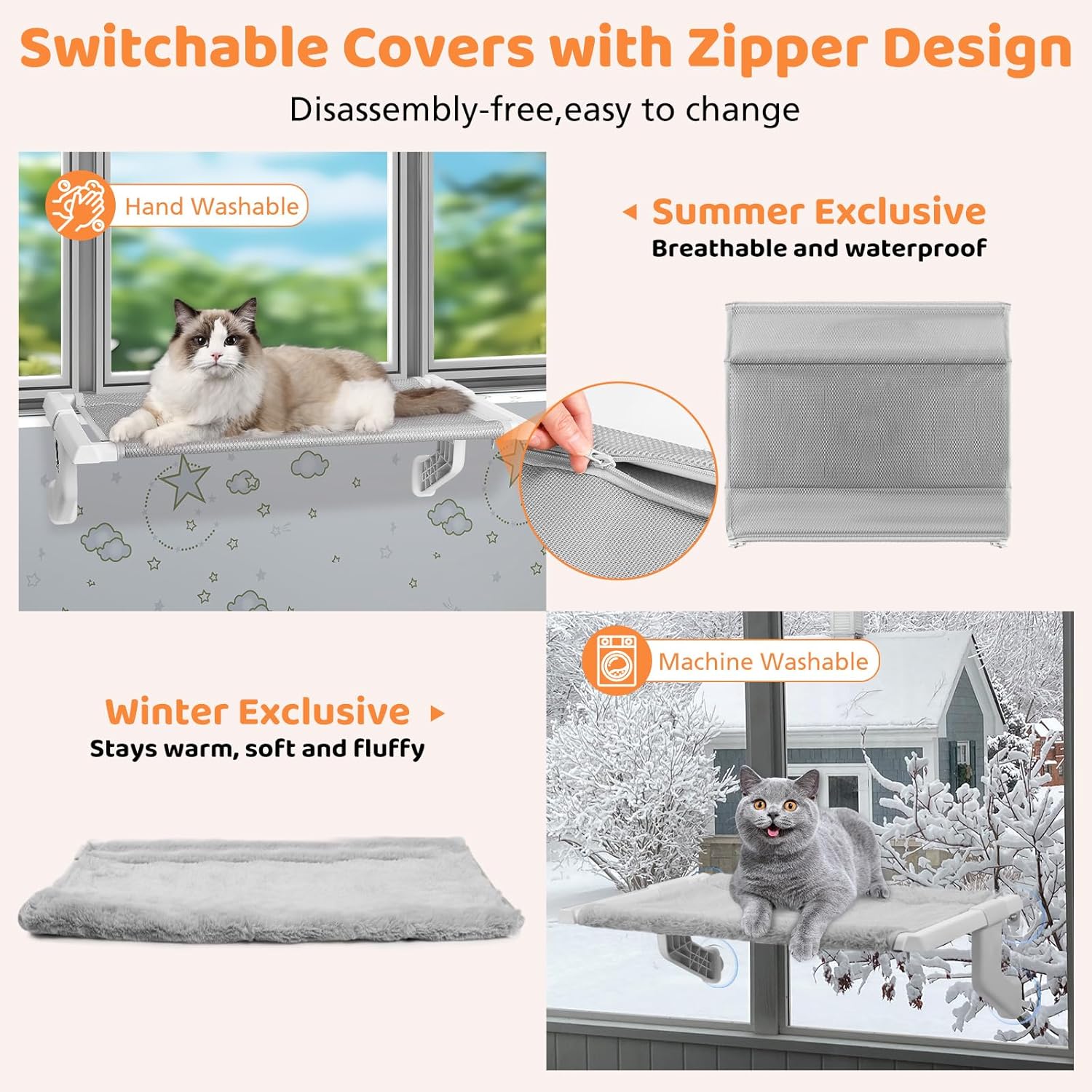 2 in 1 Cat Window Perch,Cat Hammock with Metal Sliding Clamping Adjustment,Removable Two Fabrics Cover,4 Suction Cups,Window Beds for Indoor Cat(26"x13")