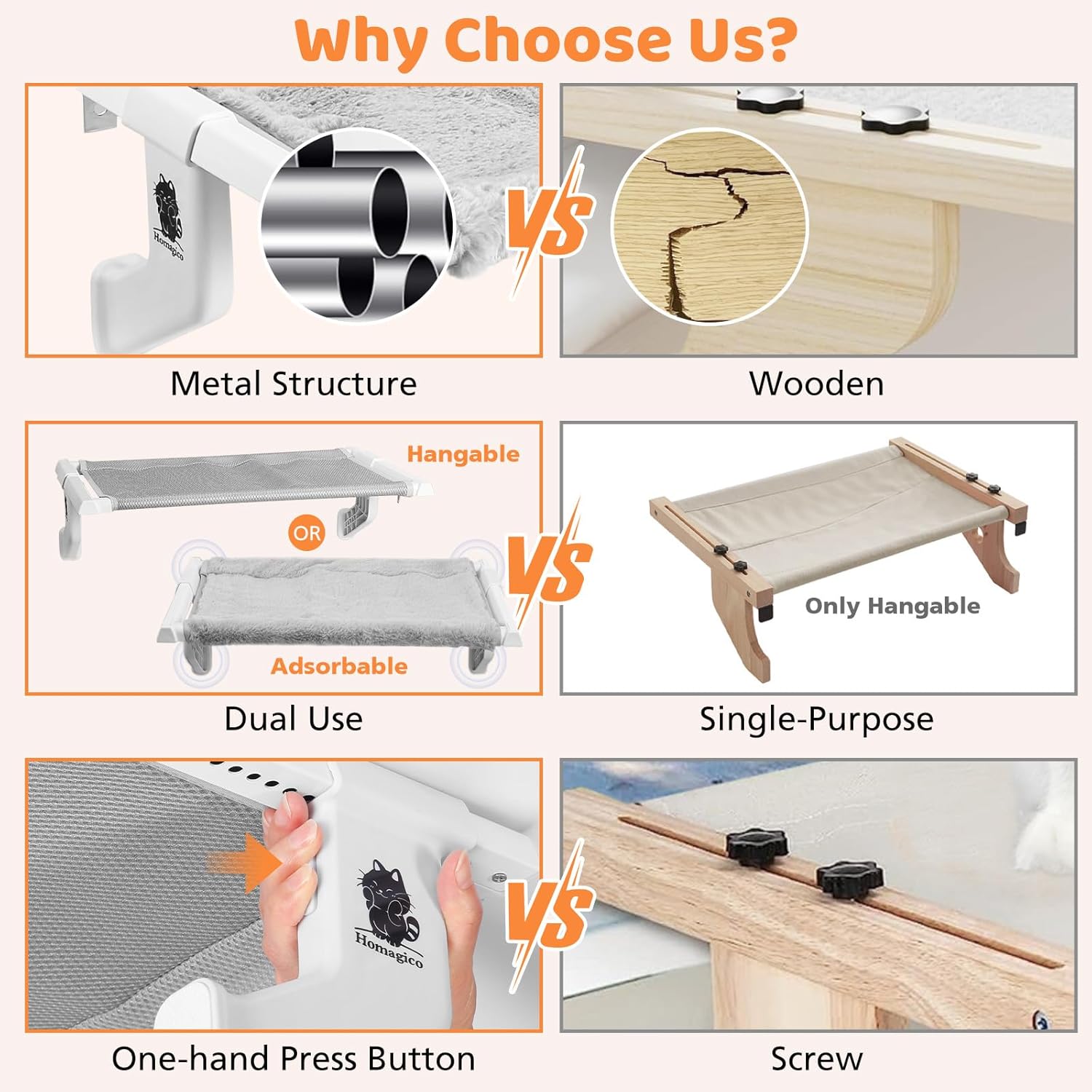 - 【2-in-1 Design】HOMAGICO Cat Hammock Window is designed with removable strong suction cups, which can be firmly attached to smooth surfaces such as glass, tiles,or conveniently hanged on the window sill or bedside with hooks, you will love this cat bed.