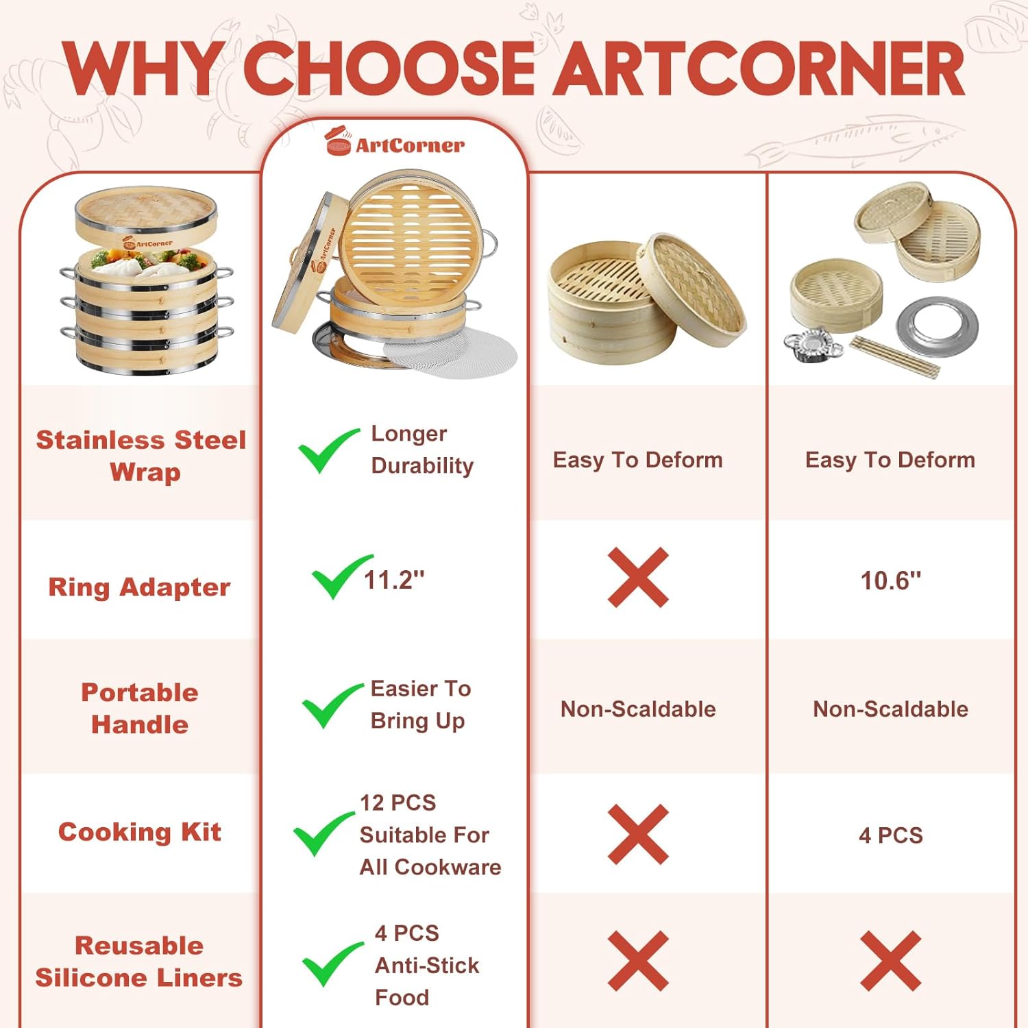 Bamboo Steamer Basket Set with Stainless Steel Handle,10 inch 2 Tier Steamer for Cooking,Dumpling Bun Vegetable Seafood Steamer,Asian Chinese Cooking