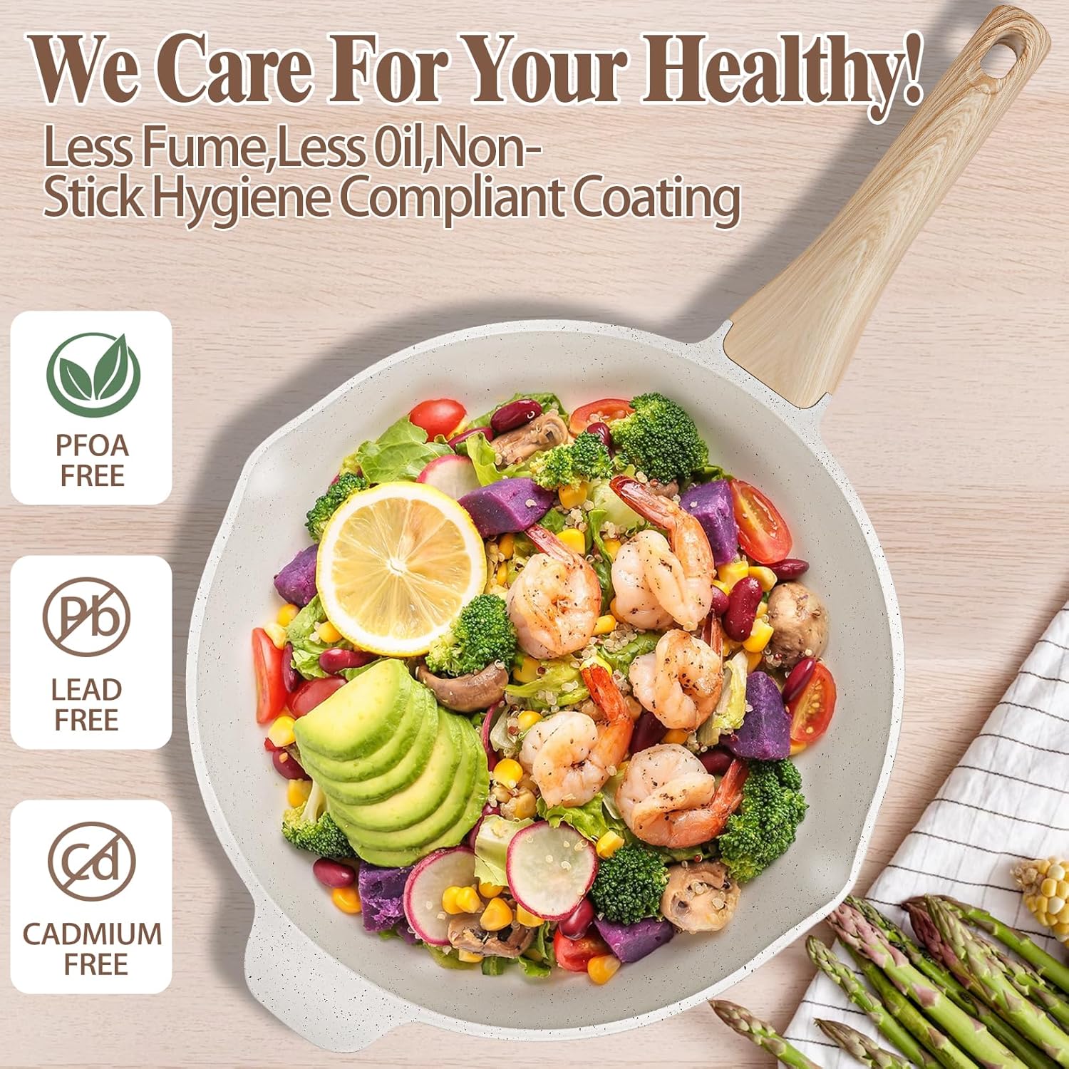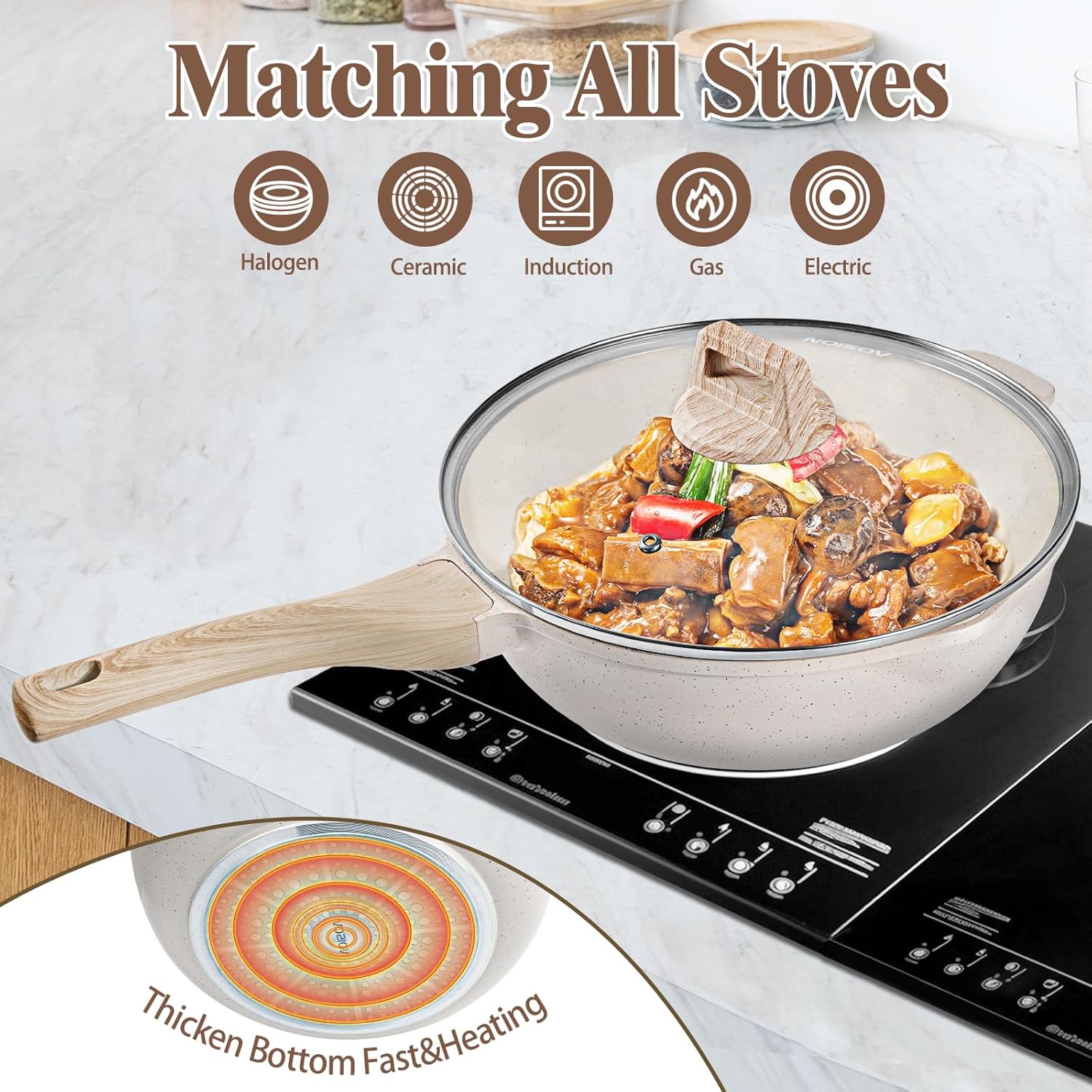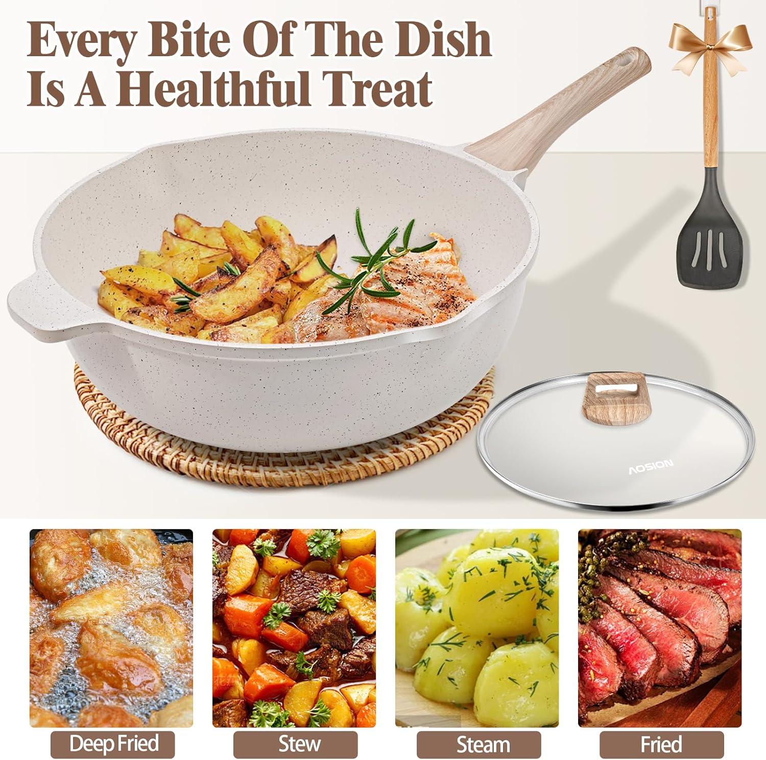- 【HEALTHY CERAMIC COATING】Our nonstick sauté pan made of natural ceramic, SGS approved. Free of PFOA & PFAS non-toxic propertie.Enjoy healthier cooking with less oil intake.The ceramic non-stick coating ensures a smokeless and safe cooking experience.