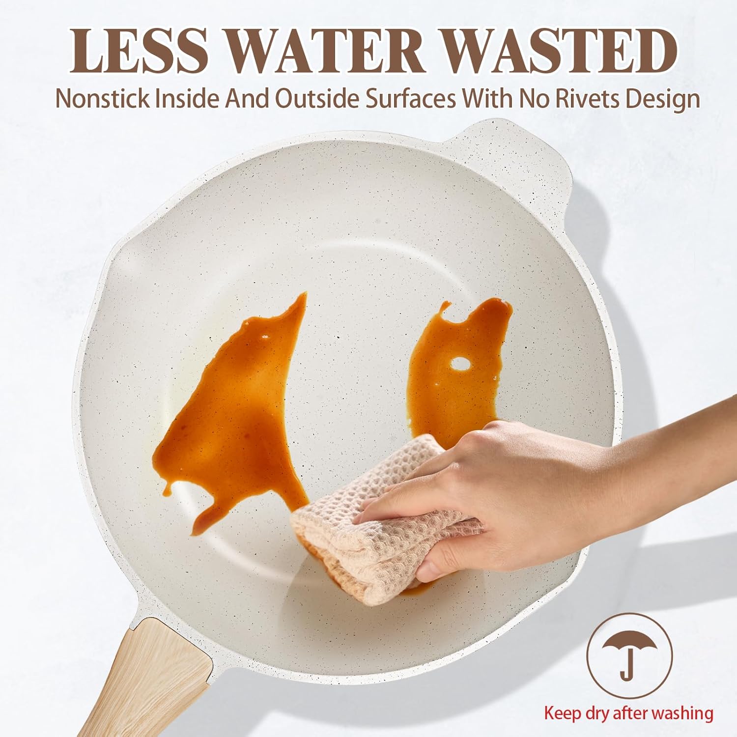 - 【EFFORTLESS CLEANING】The non-stick ceramic saute pan with the surface and rivet-free design can be easily washed away in just a few seconds with a sponge and warm soapy water rinsed under warm water. Or run it through the dishwasher to keep the ceramic skillet clean and dry.