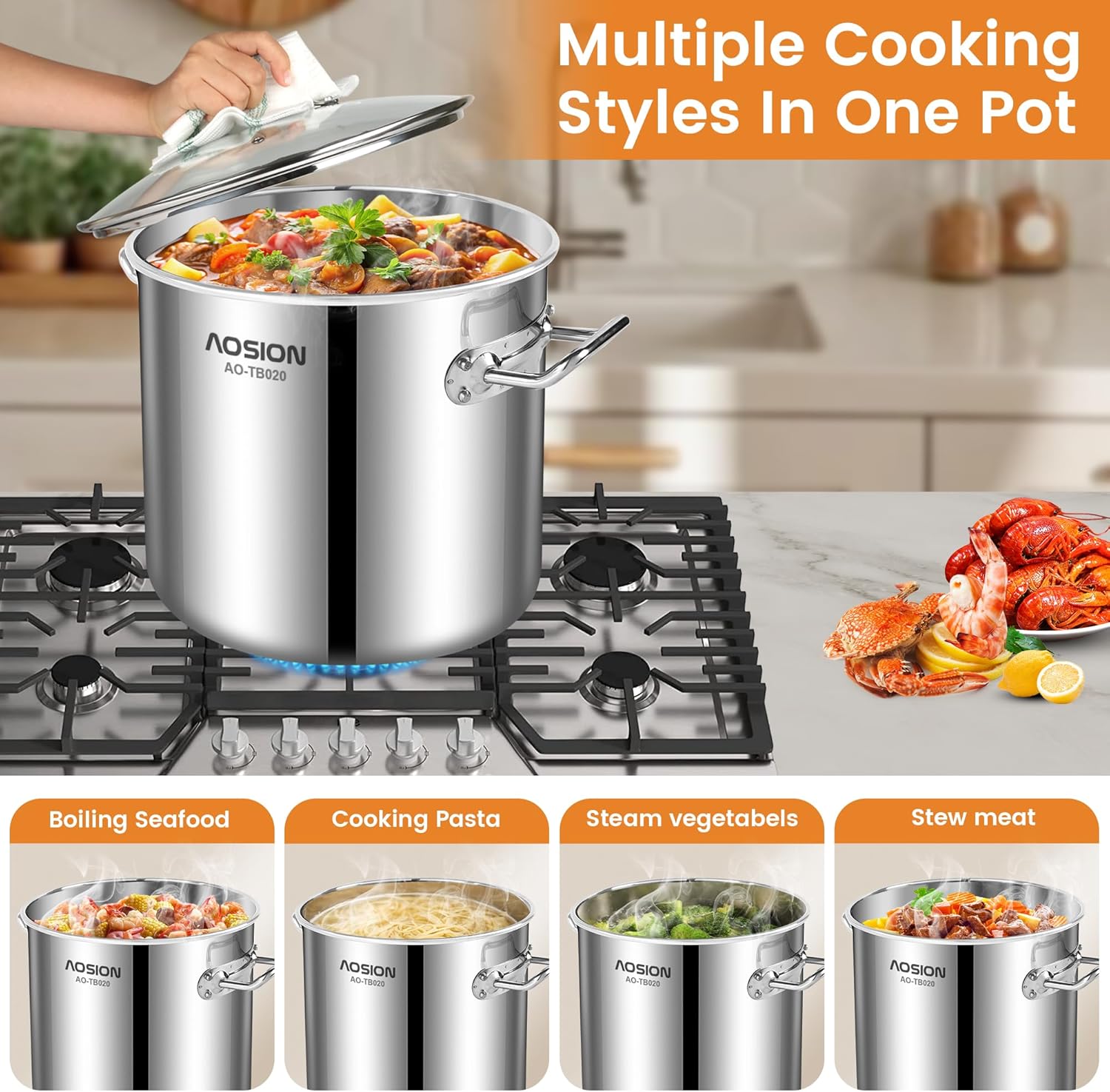 AOSION 20 Quart Stainless Steel Stock Pot With Lid,Large Induction Soup Pot with Steam Rack & Canning Jar Lifter,Healthy Polished Tamale Steamer Pot for Seafood Crab,Pasta Dishwasher & Oven Safe.