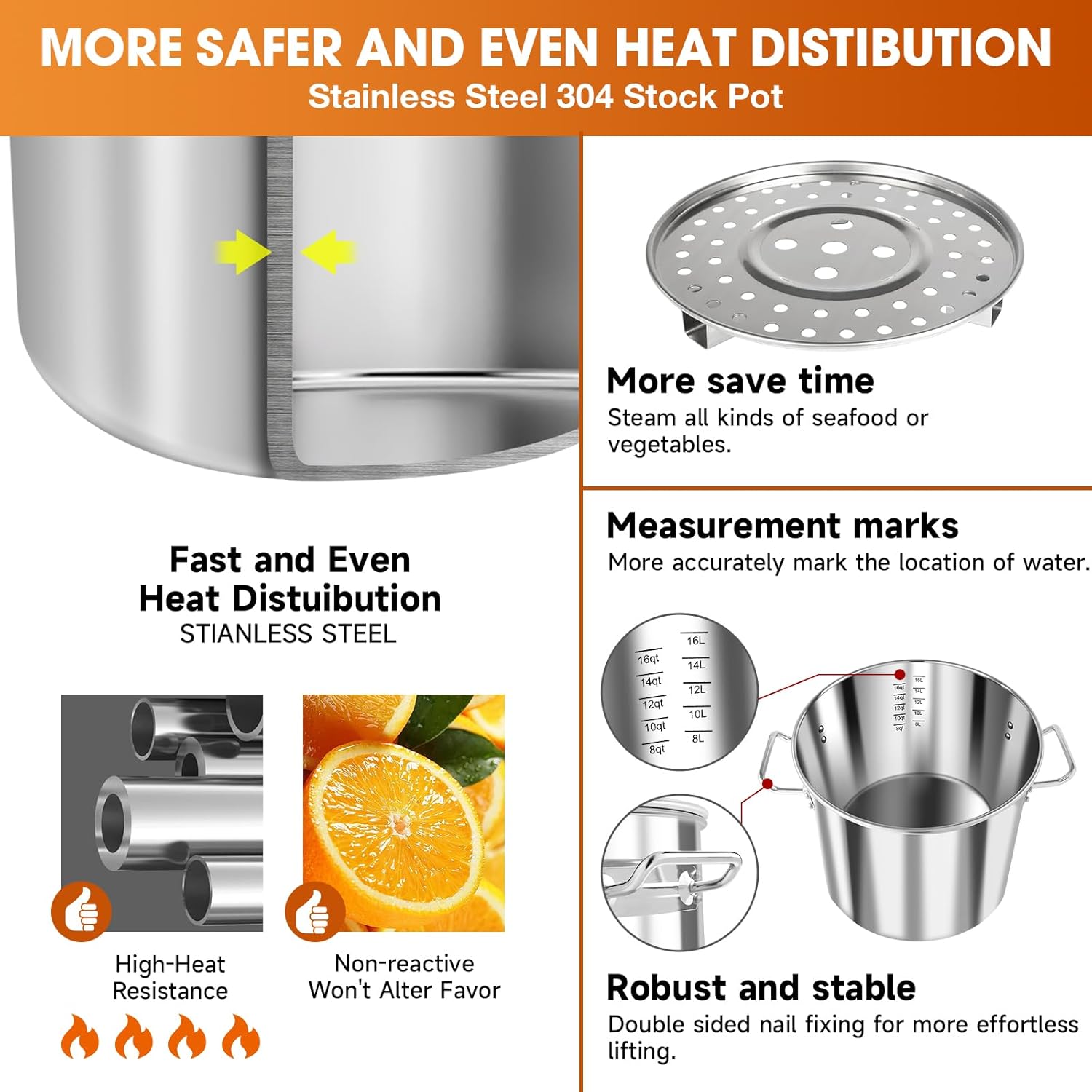 - HEAT DISTRIBUTION- The soup pot adopting the latest one-piece three-layer structure technology, stock pot with lid leaves no gap at the bottom, dissipates heat quickly and evenly, prolongs service life.