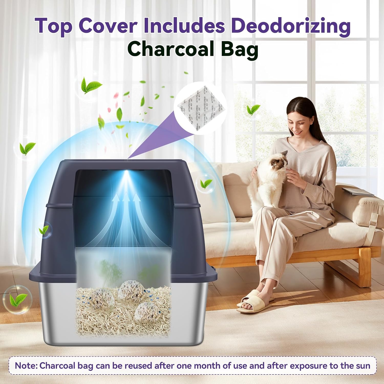 - 【Clean and Fresh】This sifting litter box is equipped with a stainless steel pan, which has a smooth surface that is easy to clean and wipe down, and odors will not adhere to it, always keeping the air fresh. The top lid also has an activated charcoal bag to better absorb odors and make you and your cat get along better!